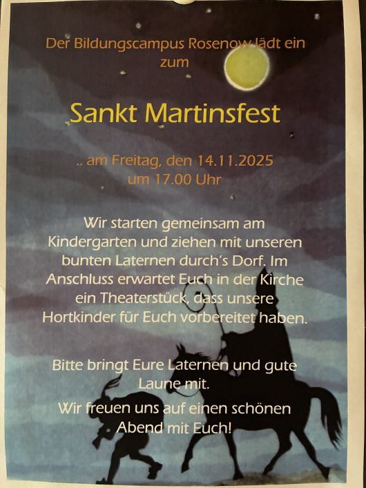 Bildungscampus Rosenow lädt ein am 14.11.2025, 17.00 Uhr zum Sankt-Martins-Fest. Beachtet das Plakat!